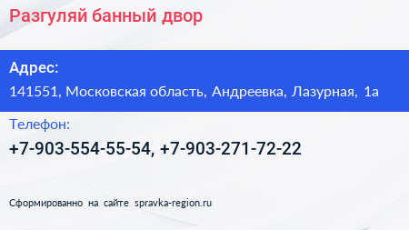 Разгуляй, банный двор по адресу 141551, Московская область, Андреевка, Лазурная, 1а в дальнейшем Организация, размещена в следующих категориях: