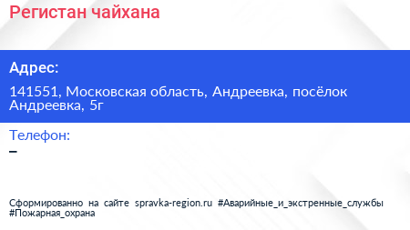 Регистан, чайхана по адресу 141551, Московская область, Андреевка, посёлок Андреевка, 5г в дальнейшем Организация, размещена в следующих категориях:
