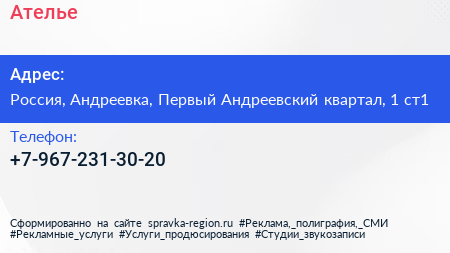 Для связи с организацией воспользуйтесь номером телефона: +7-967-231-30-20. Пн: c 09:00-17:00, Вт: c 09:00-17:00, Ср: c 09:00-17:00, Чт: c 09:00-17:00, Пт: c 09:00-17:00, Сб: c 09:00-17:00, Вс: выходной, вы можете обратиться в эту организацию.