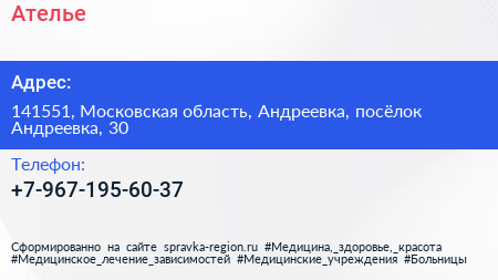 Ателье по адресу 141551, Московская область, Андреевка, посёлок Андреевка, 30 в дальнейшем Организация, размещена в следующих категориях: