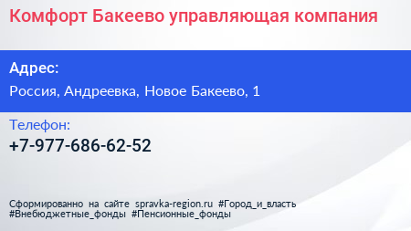Комфорт Бакеево, управляющая компания по адресу 1, улица Новое Бакеево, Коттеджный посёлок «Новое Бакеево», Бакеево, городской округ Солнечногорск, Московская область, Центральный федеральный округ, 141551, Россия в дальнейшем Организация, размещена в следующих категориях: