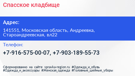 Спасское кладбище по адресу 141551, Московская область, Андреевка, Староандреевская, вл22 в дальнейшем Организация, размещена в следующих категориях: