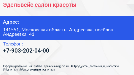 Эдельвейс, салон красоты по адресу 141551, Московская область, Андреевка, посёлок Андреевка, 41 в дальнейшем Организация, размещена в следующих категориях: