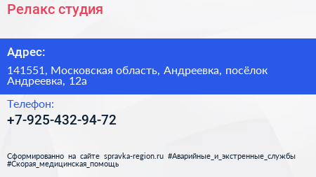 Релакс, студия по адресу 141551, Московская область, Андреевка, посёлок Андреевка, 12а в дальнейшем Организация, размещена в следующих категориях: