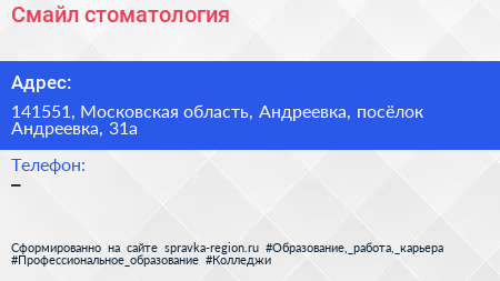 Смайл, стоматология по адресу 141551, Московская область, Андреевка, посёлок Андреевка, 31а в дальнейшем Организация, размещена в следующих категориях: