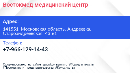 Востокмед, медицинский центр по адресу 141551, Московская область, Андреевка, Староандреевская, 43 к1 в дальнейшем Организация, размещена в следующих категориях: