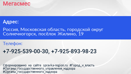 Мегасмес по адресу Россия, Московская область, городской округ Солнечногорск, посёлок Жилино, 19 в дальнейшем Организация, размещена в следующих категориях: