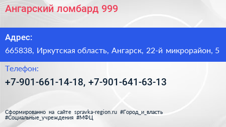Ангарский ломбард 999 по адресу 665838, Иркутская область, Ангарск, 22-й микрорайон, 5 в дальнейшем Организация, размещена в следующих категориях: