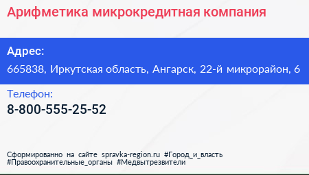 Арифметика, микрокредитная компания по адресу 665838, Иркутская область, Ангарск, 22-й микрорайон, 6 в дальнейшем Организация, размещена в следующих категориях: