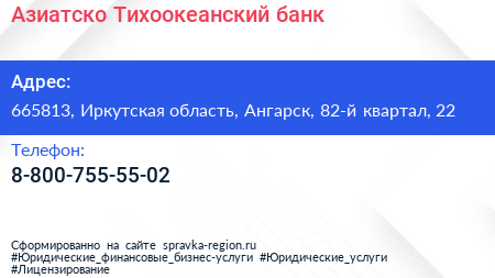 Азиатско-Тихоокеанский банк по адресу 665813, Иркутская область, Ангарск, 82-й квартал, 22 в дальнейшем Организация, размещена в следующих категориях: