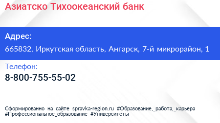 Азиатско-Тихоокеанский банк по адресу 665832, Иркутская область, Ангарск, 7-й микрорайон, 1 в дальнейшем Организация, размещена в следующих категориях: