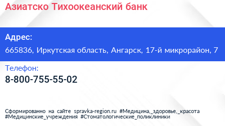 Азиатско-Тихоокеанский банк по адресу 665836, Иркутская область, Ангарск, 17-й микрорайон, 7 в дальнейшем Организация, размещена в следующих категориях: