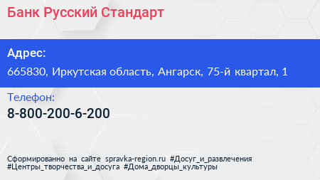 Банк Русский Стандарт по адресу 665830, Иркутская область, Ангарск, 75-й квартал, 1 в дальнейшем Организация, размещена в следующих категориях: