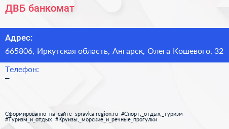 ДВБ, банкомат по адресу 665806, Иркутская область, Ангарск, Олега Кошевого, 32 в дальнейшем Организация, размещена в следующих категориях: