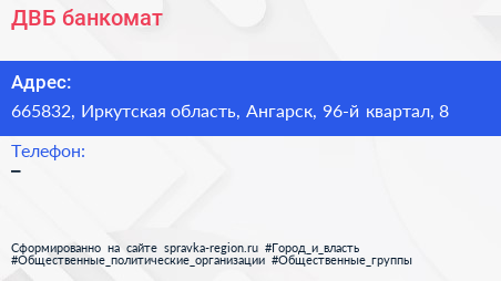 ДВБ, банкомат по адресу 665832, Иркутская область, Ангарск, 96-й квартал, 8 в дальнейшем Организация, размещена в следующих категориях: