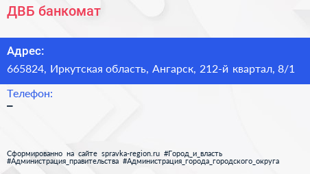 ДВБ, банкомат по адресу 665824, Иркутская область, Ангарск, 212-й квартал, 8/1 в дальнейшем Организация, размещена в следующих категориях: