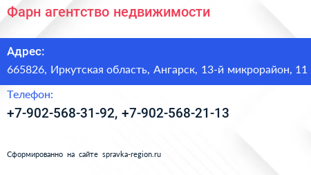Фарн, агентство недвижимости по адресу 665826, Иркутская область, Ангарск, 13-й микрорайон, 11 в дальнейшем Организация, размещена в следующих категориях: