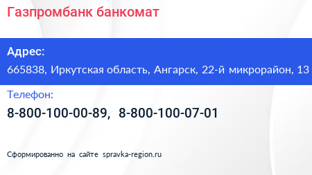 Газпромбанк, банкомат по адресу 665838, Иркутская область, Ангарск, 22-й микрорайон, 13 в дальнейшем Организация, размещена в следующих категориях: