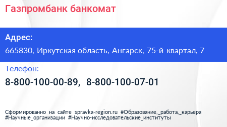 Газпромбанк, банкомат по адресу 665830, Иркутская область, Ангарск, 75-й квартал, 7 в дальнейшем Организация, размещена в следующих категориях: