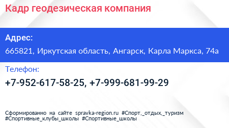 Кадр, геодезическая компания по адресу 665821, Иркутская область, Ангарск, Карла Маркса, 74а в дальнейшем Организация, размещена в следующих категориях: