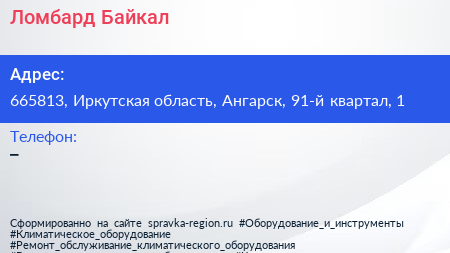 Ломбард-Байкал по адресу 665813, Иркутская область, Ангарск, 91-й квартал, 1 в дальнейшем Организация, размещена в следующих категориях: