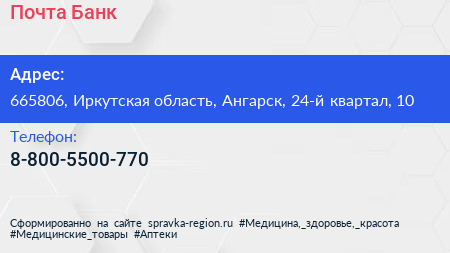 Почта Банк по адресу 665806, Иркутская область, Ангарск, 24-й квартал, 10 в дальнейшем Организация, размещена в следующих категориях: