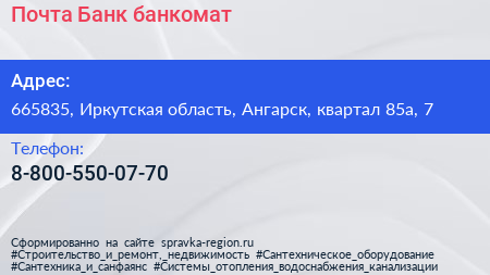 Почта Банк, банкомат по адресу 665835, Иркутская область, Ангарск, квартал 85а, 7 в дальнейшем Организация, размещена в следующих категориях: