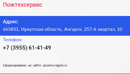 Пожтехсервис по адресу 665831, Иркутская область, Ангарск, 257-й квартал, 10 в дальнейшем Организация, размещена в следующих категориях: