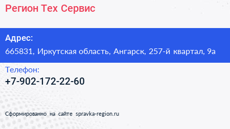 Регион Тех Сервис по адресу 665831, Иркутская область, Ангарск, 257-й квартал, 9а в дальнейшем Организация, размещена в следующих категориях: