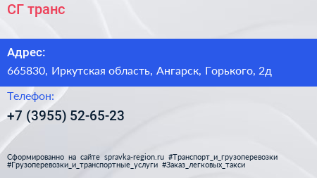 СГ-транс по адресу 665830, Иркутская область, Ангарск, Горького, 2д в дальнейшем Организация, размещена в следующих категориях: