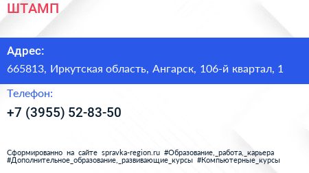 ШТАМП по адресу 665813, Иркутская область, Ангарск, 106-й квартал, 1 в дальнейшем Организация, размещена в следующих категориях: