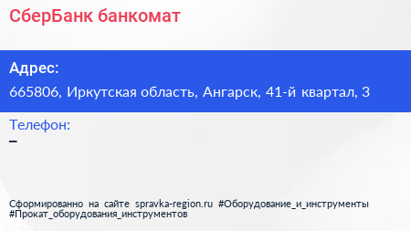 СберБанк, банкомат по адресу 665806, Иркутская область, Ангарск, 41-й квартал, 3 в дальнейшем Организация, размещена в следующих категориях: