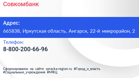 Совкомбанк по адресу 665838, Иркутская область, Ангарск, 22-й микрорайон, 2 в дальнейшем Организация, размещена в следующих категориях:
