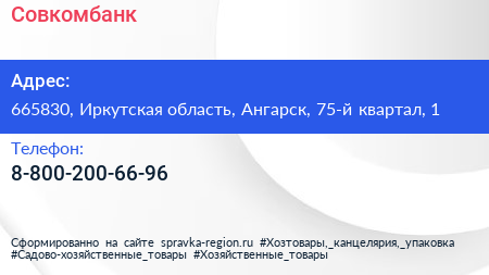 Совкомбанк по адресу 665830, Иркутская область, Ангарск, 75-й квартал, 1 в дальнейшем Организация, размещена в следующих категориях: