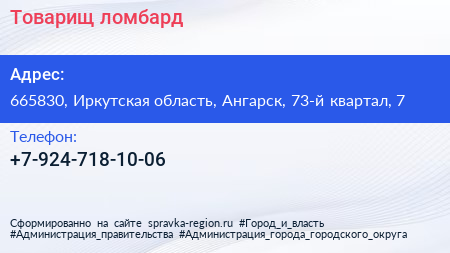 Товарищ, ломбард по адресу 665830, Иркутская область, Ангарск, 73-й квартал, 7 в дальнейшем Организация, размещена в следующих категориях: