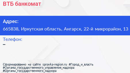 ВТБ, банкомат по адресу 665838, Иркутская область, Ангарск, 22-й микрорайон, 13 в дальнейшем Организация, размещена в следующих категориях: