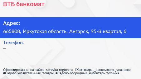 ВТБ, банкомат по адресу 665808, Иркутская область, Ангарск, 95-й квартал, 6 в дальнейшем Организация, размещена в следующих категориях: