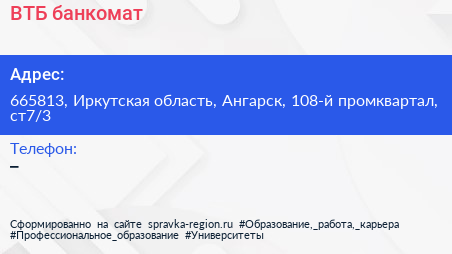 ВТБ, банкомат по адресу 665813, Иркутская область, Ангарск, 108-й промквартал, ст7/3 в дальнейшем Организация, размещена в следующих категориях: