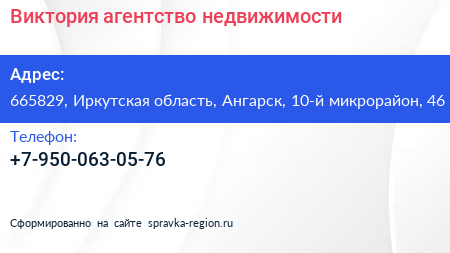 Виктория, агентство недвижимости по адресу 665829, Иркутская область, Ангарск, 10-й микрорайон, 46 в дальнейшем Организация, размещена в следующих категориях: