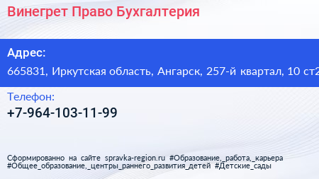 Винегрет.Право.Бухгалтерия по адресу 665831, Иркутская область, Ангарск, 257-й квартал, 10 ст2 в дальнейшем Организация, размещена в следующих категориях: