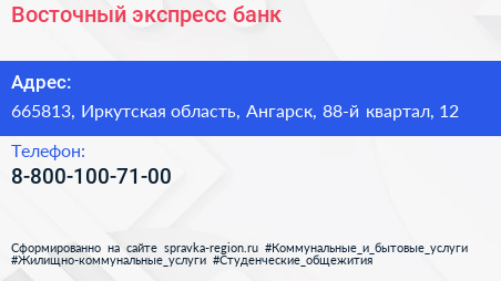 Восточный экспресс банк по адресу 665813, Иркутская область, Ангарск, 88-й квартал, 12 в дальнейшем Организация, размещена в следующих категориях: