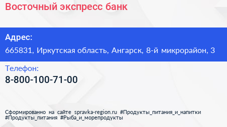 Восточный экспресс банк по адресу 665831, Иркутская область, Ангарск, 8-й микрорайон, 3 в дальнейшем Организация, размещена в следующих категориях: