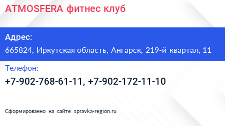 ATMOSFERA, фитнес-клуб по адресу 665824, Иркутская область, Ангарск, 219-й квартал, 11 в дальнейшем Организация, размещена в следующих категориях: