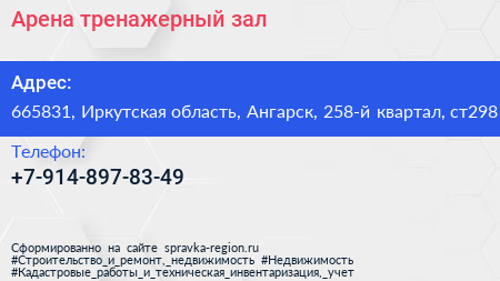 Арена, тренажерный зал по адресу 665831, Иркутская область, Ангарск, 258-й квартал, ст298 в дальнейшем Организация, размещена в следующих категориях: