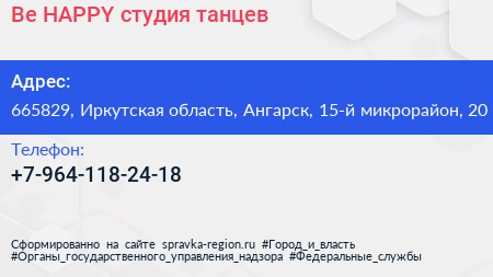 Be HAPPY, студия танцев по адресу 665829, Иркутская область, Ангарск, 15-й микрорайон, 20 в дальнейшем Организация, размещена в следующих категориях: