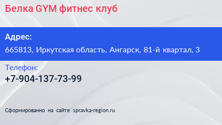 Белка GYM, фитнес-клуб по адресу 665813, Иркутская область, Ангарск, 81-й квартал, 3 в дальнейшем Организация, размещена в следующих категориях:
