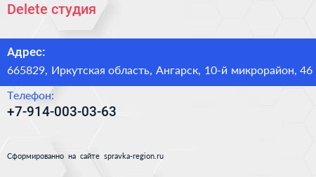 Delete, студия по адресу 665829, Иркутская область, Ангарск, 10-й микрорайон, 46 в дальнейшем Организация, размещена в следующих категориях: