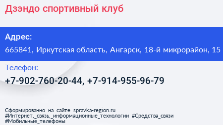 Дзэндо, спортивный клуб по адресу 665841, Иркутская область, Ангарск, 18-й микрорайон, 15 в дальнейшем Организация, размещена в следующих категориях: