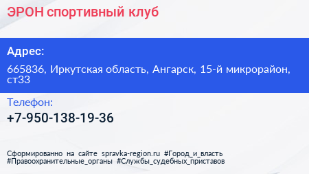 ЭРОН, спортивный клуб по адресу 665836, Иркутская область, Ангарск, 15-й микрорайон, ст33 в дальнейшем Организация, размещена в следующих категориях: