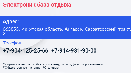 Электроник, база отдыха по адресу 665855, Иркутская область, Ангарск, Савватеевский тракт, 2 в дальнейшем Организация, размещена в следующих категориях: